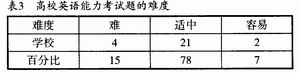 表3显示,大部分学校认为高校英语能力考试的难易度适中的,只有15%的学校认为较难,后者多为新成立的民办高校或3+3中高职相通生占很大比例的学校。上海地区近二年的高校英语能力考试亦显示,通过率有所下降,但总平均分无明显下降,标准差则从11.28上升至14.77;而试卷的难易系数稳定在12.06左右。