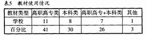 41%的学校用高职高专类的教材,比起前几年已增加了许多。26%高职高专类与本科类混合作用。其中大多数为高校英语能力考试通过后即改用本科类教材,目的是为了参加大学英语四级考试。也有的学校是因专业而异,有的专业用高职类教材,有的则用本科类教材。
