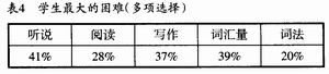 为了正确引导学生学好英语,笔者认为有必要了解其学习的困难所在。统计数字显示,41%的学校认为听说最困难,认为词汇困难的学校占39%,与最困难的项目只相差2%,远远超过语法结构。