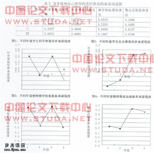 该分析结果验证了本文提出的假设1、假设2,即在高校师生心理契约的内容结构中,学生智能自我培养的心理契约责任强度一到四年级是高低波动的;学生社会智能自我培养的心理契约责任强度从一年级到四年级逐渐增强。从表2均值统计结果中我们还可以看出,本文假设3得到了部分验证,即师生心理契约中教师教学技能提高的责任强度随学生期望强度的变化而变化;而教师敬业品格修养责任强度虽然呈现出的一定波动,但与学生社会智能自我培养责任强度三、四年级比一、二年级高的总趋势也是一致的。