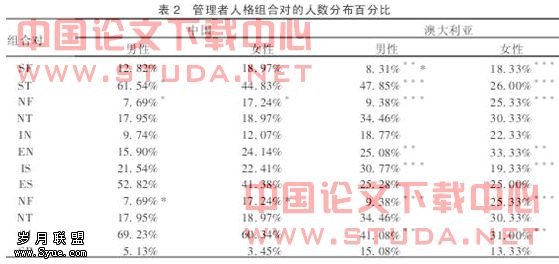 MBTI分析三类组合对:功能组合对SF、ST、NF、NT,与个体的沟通方式、职业选择和问题解决模式有关;象限组合对IN、EN、IS、ES,与个体的领导方式、学习方式、工作方式、变革模式有关;气质组合对NF、NT、SJ、SP。三类组合对在中国和澳大利亚管理者中的人数分布见表2。