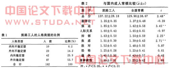 2.1筑路工人的人格类型从表1中可以看出,称定型人格人数的比例明显高于不称定型人格类型的比例,并且外向称定型人格人数比例明显商于内向稳定型人格人数比例.