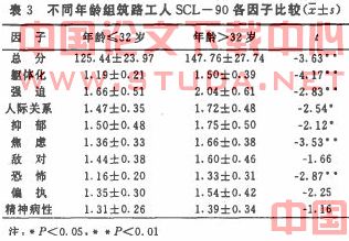 在总分以及躯体化、强迫、人际关系、抑郁、焦虑、恐怖、偏执7项因子上年龄大于32岁的筑路工人的得分要明显高于年龄小于等于32岁的筑路工人的得分,且差异有统计学意义。由此可以认为,年龄大于32岁的筑路工人比小于32岁(含32)的筑路工人的心理问题严重,主要表现在躯体化、强迫、人际关系、抑郁、焦虑、恐怖、偏执等7个方面.