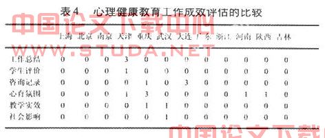 心理健康教育工作成效评估包括有定期的工作、学生对心理健康教育工作的评价、学校有无心理健康教育的咨询记录、是否重视校园心育氛围、是否重视教学的实效性、心理健康教育是否取得一定社会影响并为其他学校提供示范作用。如表4所示:各省市对心理健康教育工作所取得成效的评估都不够重视,天津、重庆、河南、陕西在中小学心理健康教育工作成效评估标准中提出重视校园心育氛围;重庆、武汉提出心理健康教育教学要有实效性。除此以外,各省市对心理健康教育工作总结、学生对心理健康教育的评价、有咨询记录、校园心理健康教育氛围、教学实效性、产生社会影响并为他校提供示范作用这几项标准都没做出要求。