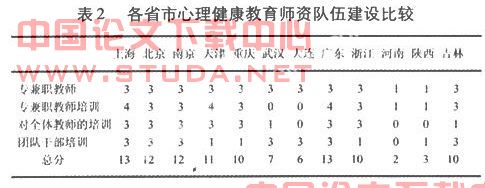 中小学心理健康教育师资队伍建设包括有专兼职教师、对专兼职教师的培训、对全体教师的培训、团队干部培训四项指标。如表2所示:上海、广东、北京、南京在师资队伍建设这一标准中的得分要求比其他地区高,其中广东省将取得心理健康教育教师的资格分为三个等级,要求各镇以上学校有“A级证书”教师一名以上,中小学以上学校至少每校有“B级证书”教师2人;60%以上中小学有“C级证书”教师3—5人,校长、主任、团队干部基本上都参加过培训;在有专兼职教师这一指标中河南、陕西的中小学心理健康教育评估标准中只提到要有专兼职教师,但没有人数限制,其他10个地区都对专兼职教师的人数有各自的限制;武汉、大连未将对专兼职教师的培训作为一项评价指标;此外,在全体教师的培训这一标准中上海、北京、天津等地每年都举行1—2次对全体教师的心理健康教育讲座,在教师团队化建设方面,南京要求建立一支以思想课教师、班主任和团、共青团、少先队干部为主体,专兼职心理辅导教师为骨干的心理健康教育教师团队;而天津、陕西、重庆、浙江的教师团队中主要是专兼职教师和班主任。