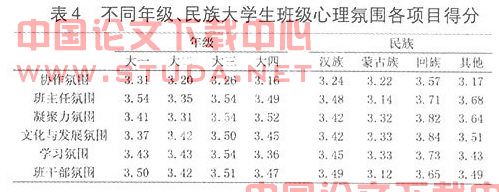 表4中的数据表明,从年级上看,协作氛围方面,大一年级最高,大四年级最低;除协作氛围外,大三年级的其他各维度水平都是最高的,班主任氛围、凝聚力氛围、班干部氛围在大二年级达到了最低水平,文化发展氛围的最低点出现在大一,学习氛围的最低点出现在大四。从民族上看,协作氛围方面,其他选项最低;除协作氛围外,蒙古族在各方面的水平最低,回族在各个维度的水平都是最高的。