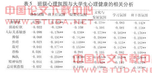 对大学生心理健康状况与班级心理氛围各维度相关分析,结果见表5。