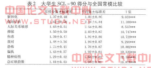 大学生心理健康状况直接影响大学的学习和生活以及未来发展。从本研究的结果中可以看出,被调查群体大学生的心理健康水平显著低于全国标准,这就是说这些学生的整体心理健康水平较差,有些甚至存在心理问题的隐患,比如精神病性和强迫症状。这是由两方面原因构成的:第一,当今社会竞争压力越来越大,大学作为学生今后走向工作岗位的准备阶段,势必要为未来的出路和发展做好打算。现在社会充斥着失业、次贷危机等这种足以颠覆社会稳定的不安因素,在校大学生由于文化水平较高,能够很好的认识到这一点,相应的生存压力也就越加明显,所以在心理健康的各个维度上表现出了较为明显的心理健康问题。第二,由于本研究所用的常模标准指定的时间较早,相信经过了多年的发展,这个常模的标准程度已经随着人们工作、生活等方面竞争的不断加剧出现下降的可能,所以在最近的一些应用该常模作标准的研究中,很多研究者都得出了被调查群体德心理健康水平远远低于常模的结论。相信这也是本研究出现大学生心理健康看有这一结论的主要原因。