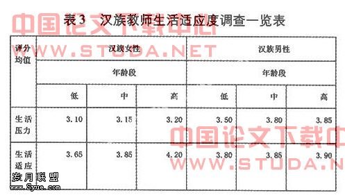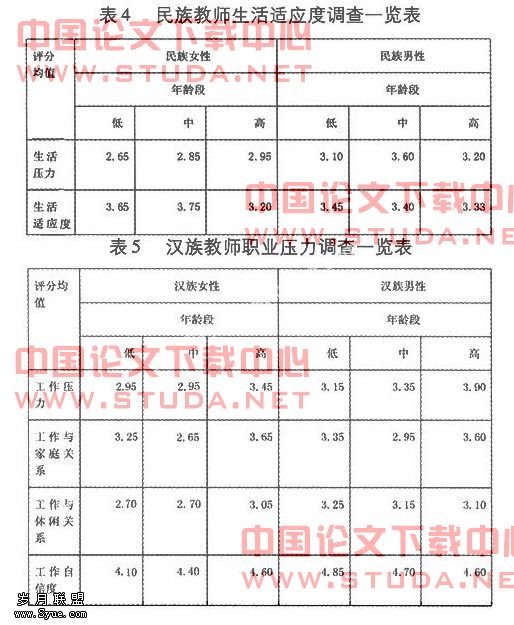 教师随年龄增长生活压力减小。女教师生活压力大于男教师,民族教师大于汉族教师。青年时汉族女教师生活适应力不及男教师以后逐渐强于男性(表3)。民族女教师的生活适应能力强于男教师,高年龄组生活适应能力较差(表4)。