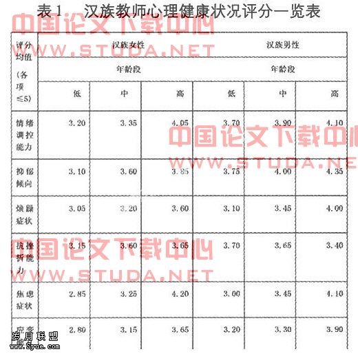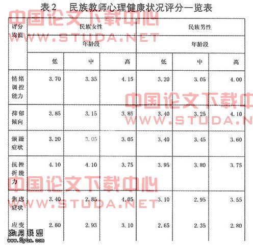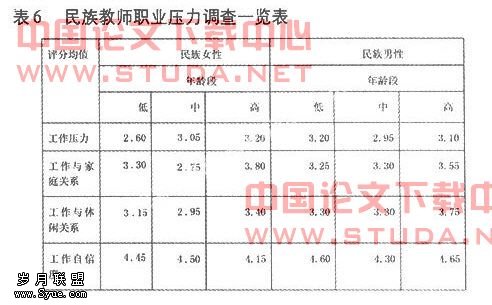 随年龄增长,汉族教师心理健康水平提高,而民族教师心理健康呈现“V”型趋势,中年龄段者心理健康水平低于其他年龄段者。汉族男教师心理健康状况好于女教师。民族女教师心理健康状况好于男教师。36岁以下民、汉高校教师生活压力大;女教师生活压力大于男教师;民族教师生活压力大于汉族教师。36岁以下教师工作压力大,而中年龄段者不仅工作压力较大,且工作紧张程度最高。民族教师工作压力比汉族教师大。女教师工作自信度不及男教师。且汉族男教师自信度最高。