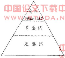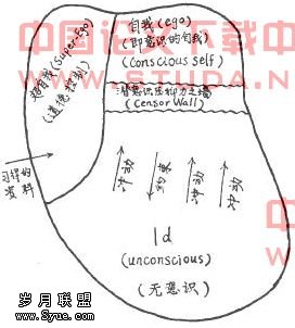 他设想人的内心存在着这样一些领域:意识((conscious)、前意识(pre-cons-cious)、无意识(unconscious)、里比度(libido)、潜意识压抑力(censor)等。前意识是蓄存一个人过去的经验和冲动的地方;无意识是较深地蓄存人们性格的原始的强烈’感情的地方。病人在催眠后回忆起来的一些事情,常人有时在梦中、在白日梦中、在脱口而出的言语中均能表现出这种无意识,里比度是性的冲动,弗洛伊德认为它是人类一切行为的基本动力;而潜意识压抑力则是社会的或者公认为该禁忌的一些习俗使个人自觉地去抑止的效果(inhibitory effect)。弗洛伊德从人的梦中寻找一些无意识。他对梦的解释往住与性冲动有关,认为梦中一些事物是性的象征。他把这些领域绘图表示如下: