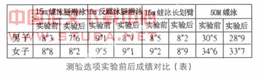 说明:所列成绩为平均值(x)。蛙泳长划臂一次达不到15m继续做第二个长划臂,直至15m处。