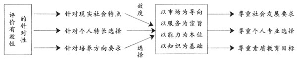 作为教学质量管理的检查性评价,其有效性应该体现在能不能找到教学过程中的不足和问题,总结出成功的经验和教训,提出今后改进提高工作的思路和措施。作为选拔升学输送人才的选拔性评价,其有效性应该体现在是否能为学校下一阶段的教学挑选到适合的优秀人才,进行深造。也就是说,质量管理型教育教学评价工作,指向的是现阶段的工作效果的检查和校正。升学选拔性评价工作指向的是为学生、教师适应今后的教学任务服务,为高一级学校教育培养目标选人。因此,我们在开展评价工作的时候,要将这两类评价区分开来进行研究。对现在的质量管理评价我们要尽可能全面深入,对升学选拔性评价我们要更多地考虑高一级学校教育教学培养目标的需要。实际上我国现行的升学体系中,从初中毕业开始,学生已经开始了分流,即:职普分流,允许学生开始“术业有专攻”,在高中毕业升大学时,学生已经开始有了专业的选择,进行了二次分流,而在大学毕业升研究生时,又开始了第三、四次分流。这是人才培养成长的规律,我们应该对这一规律进行深入探讨以提高评价效度的针对性。在教育评价时,在效度上,我们必须尊重(见图2)。