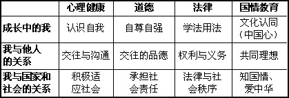 新的思想品德课程设计以心理、道德、和国情教育等内容为横坐标,以成长中的我、自我与他人、自我与社会为纵坐标,作为内容整合的逻辑。基本框架结构如下表所示。