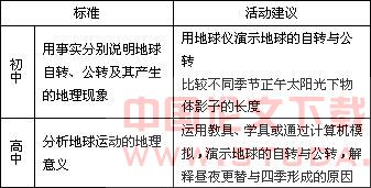 初中课标对地球运动的教学要求有很大的弹性,既视地球自转和公转的中心、方向、周期等基础知识为学生已经具备的知识,但又不要求学生系统地掌握、理解和分析地球运动的地理意义,标准中还有意用地理现象代替地理意义,对于地理现象也没有作明确的要求,且以行为目标陈述方式要求学生用事实来说明。此处事实和地理现象可作等同理解,即可以理解为用地理现象说明地球的运动,也可以理解为地球运动产生哪些地理现象。因此,只要学生分别能用事实(哪怕是一条)说明地球的自转和公转,或者说学生能分别说明哪些现象(哪怕是一种)是由自转或公转产生的,就达到了标准的要求。