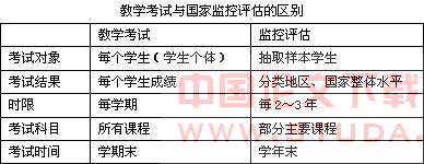 在基础课程改革实验中,一方面淡化学校教学的压力,把考试放权于学校和教师;另一方面也应重视国家和区域对教学质量的监控评价。可采取抽样和细致的统计分析手段,提出评价报告。这对基础教育课程改革可以起到非常好的促进作用,前者调动和发挥了学校与教师改进教学的主动性和积极性,使考试成为为学习的考试。后者则对整体的教育质量作出评判,并对课程标准、教材等提出有关教育政策的评估意见。尽管学校教学考试与国家评估有许多区别和不同(见下表),但它们都在运用考试,考试的目的都是为促进教与学,而不是左右教与学。
