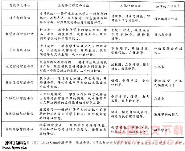 一、多元智能评估首先要采用“智能展示”的方法鉴定每个学生智能的强项和弱项,在此基础上设计多元的、弹性化的评估标准,采用个体内差异评估,使每一位学生都有可能在原有的基础上得到肯定的评估
