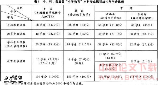 总体上说,当前世界发达国家与地区小学教师职前培养的四年制本科课程方案的共性特点是课程结构类型基本相同,课程设置基本上能体现培养小学师资的时代性、综合性、基础性与发展性的专业特点。笔者曾结合课题研究对韩国和我国省有关高校的本科学历小学教师培养作了实地考察与调研。下面以中、韩、美三国具有一定代表性的“小学教育”(或“初等教育”)本科专业课程结构与学分比例作一比较(详见表1)。