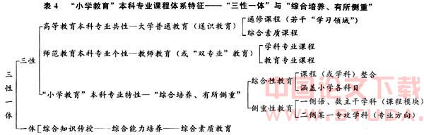 综上所述,新设置的“小学教育”本科专业的课程方案应具有“三性一体”与“综合培养、有所侧重”的特征。所谓“三性”,一是体现我国高等教育本科专业课程设置的共性──大学普通教育(即开设“通识教育课程”或“公共基础课程”);二是体现高等师范教育本科专业课程设置的个性──“教师教育”或“双专业教育”(即专业课同时开设“学科专业课程”与“教育专业课程”);三是体现“小学教育”本科专业特性──“综合培养,有所侧重”课程培养模式。所谓“综合培养”即课程设置不仅仅体现涵盖小学教学各科目的综合性教育,同时还应体现与加强课程或学科的交叉整合,以适应我国“以综合课程为主”的基础教育小学阶段的新课程改革特点(小学阶段共设9门课,其中5门为综合课程)。所谓“有所侧重”即指在综合学习各学科基础性课程的基础上,能同时侧重语文、数学两个主干学科(课程模块)学习,并能专攻某个学科(专业方向),以体现“以人为本”的个性化教育,培养既能适应“小班化”包班制教学,又能侧重兼教语、数两门主干课程,并能进行某门学科研究性教学的新型小学师资。“一体”即按小学教师专业化要求与职业特点,在课程体系中融综合知识传授、综合能力培养、综合素质教育于一体(详见表4)。[3]