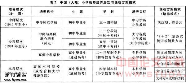 随着中国社会经济的发展与国民素质的提高,自20世纪80年代中期始,中国(大陆)师范教育培养体制与培养模式起了量至质的变化。自1984年我国南通师范学校招收初中毕业生培养五年一贯制专科程度小学教师的大专班开始,我国部分经济发达地区先后进行了培养大学专科、本科层次小学教师的试点工作。1992~1994年又先后批准了全国65所中等师范学校与所在地区的高等师范院校联合办学,招收初中毕业生,采用“五年一贯制”或“三二分段制”的模式进行培养大学专科程度小学教师的试点工作(因这一试点尚未列入高等教育专业范畴,又称之为初等教育“大专学历班”)。其中,“五年一贯制”课程方案即前三年基本设置普通高中课程,后二年基本按侧文(语文)、侧数(数学)方向设置高师二年制专科课程;“三二分段制”课程方案即前三年基本设置中等师范学校三年制课程,后二年基本按侧文(语文),侧数(数学)方向设置高师二年制专科课程。此两种培养模式的特点均为“3+2”加叠式课程模式,均按侧语、侧数方向培养,初中起点的学生在完成前三年学习并通过当地教育行政部门规定的有关课程考核后,便可不经过高考直接升入后二年专科学习。该类模式在三级师范向二级师范过渡的特定时期具有一定的必要性、可行性与社会效应。但我国高等教育法明确规定普通专科、本科院校的生源必须是高中毕业生,其培养任务必须由高等学校承担,因此,随着高等教育的依法办学的规范性、科学性及中等师范学校的撤销、合并、升格,我国经济发达省市已停止试行(或逐步减少)初中起点大专学历小学教师的培养模式,取而代之的是高中起点、通过高考招生培养的二~三年制专科学历的小学教师,其课程方案一般按侧文或侧理方向构建。