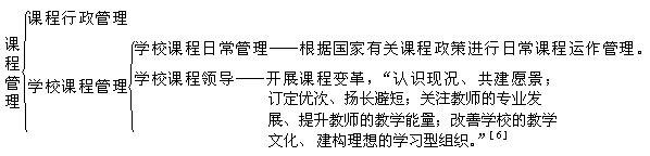 从管理学的角度来看,教育管理可分为教育行政管理和学校教育管理。由此,我们可以将课程管理分为:课程行政管理和学校课程管理两个方面。在这两者之中,课程研制是贯穿两者的一条红线。前者是国家(政府)对课程的行政管理,包括立法、课程政策制定、课程标准的颁布、教科书的审定、学校课程实施和评价的监督。后者包括学校课程日常管理和学校课程领导,是学校对如下项目进行的管理:课程目标的校本化确认,国家课程、地方课程的校本化选择和组织,课程实施和课程评价。学校课程日常管理是学校的校长、课程主任(教导主任)、教师根据国家有关课程政策进行日常课程运作管理。学校课程领导的职责范围主要体现在学校层面。领导的职能涵盖了学校课程研制、教师专业发展、课程资源和文化再生等多个方面。正是因为领导的职能是带来变革,笔者认为,课程领导是校长及相关课程发展人员在学校层面对课程研制正确且合理发挥作用、带来变革的活动。课程领导是统领学校层面的课程研制的活动,即在课程目标、课程内容选择、课程组织、课程实施和课程评价等方面发挥导引和指挥作用,实现预期的课程改革和课程研制目标,影响课程改革和课程研制的结果的活动。