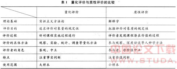 所谓量化教育评价,就是“力图把复杂的教育现象简化为数量,进而从数量的分析与比较中推断某一评价对象的成效”。[1]这种评价方法在20世纪60年代之前占据主导地位。随后,人们认识到评价不是一个单纯的技术问题,纯粹价值中立的描述是不存在的,价值问题在评价中凸显出来,质性评价应运而生。量化评价与质性评价是课程评价中的两种基本方法,这两种方法在理论基础、评价目的、评价过程、评价的具体方法、评价的角色、评价的特点以及使用范围等方面都有显著的不同。为清晰起见,本文用表格对二者作一比较,见表1。[1]