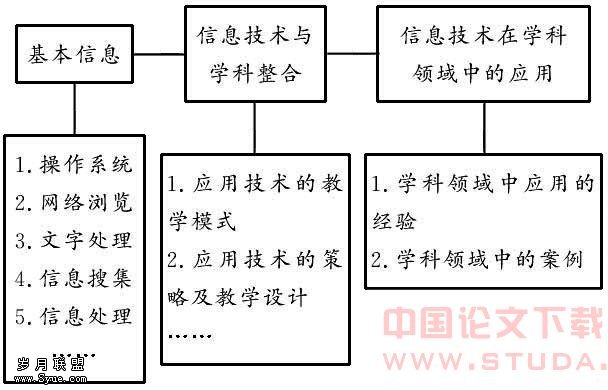 根据国际主要国家和地区的信息素养课程的比较和目前信息技术培训内容的分析,笔者将教师信息技术培训的具体内容划分为基本信息、信息技术与学科整合、信息技术在学科领域中的应用三个层次(详见图1)。