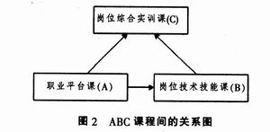 岗位系列课程培养目标(ST):应依据岗位能力需求确立并为岗位能力培养服务,ST也是岗位系列课程知识技能体系构建的核心依据。 单元目标(UT):岗位系列课程结构体系中每一个单元均应达到某个具体的目标,称之为单元目标。 基础单元(FU):是岗位系列课程培养知识体系的根基,应最大化地为AU服务。FU的知识体系应综合基础UT来构建。 能力单元(AU):本单元知识技能体系构建应直接为实现岗位能力需求服务。AU的知识技能体系可以面向能力模块化,采取阶段性的技能训练方式,应为PU服务。 实训单元(PU):本单元岗位系列知识技能体系的综合应用,其单元目标应尽量与岗位系列课程培养目标接近。 二、岗位系.列课程的结构与特点 1.岗位(群)系列课程结构 岗位课程结构:职业平台课(A)+岗位技术技能课(B)+岗位综合实训课(C)+职业资格证书。该课程结构也称为ABC课程结构,ABC三课程间的关系如图1、图2所示。