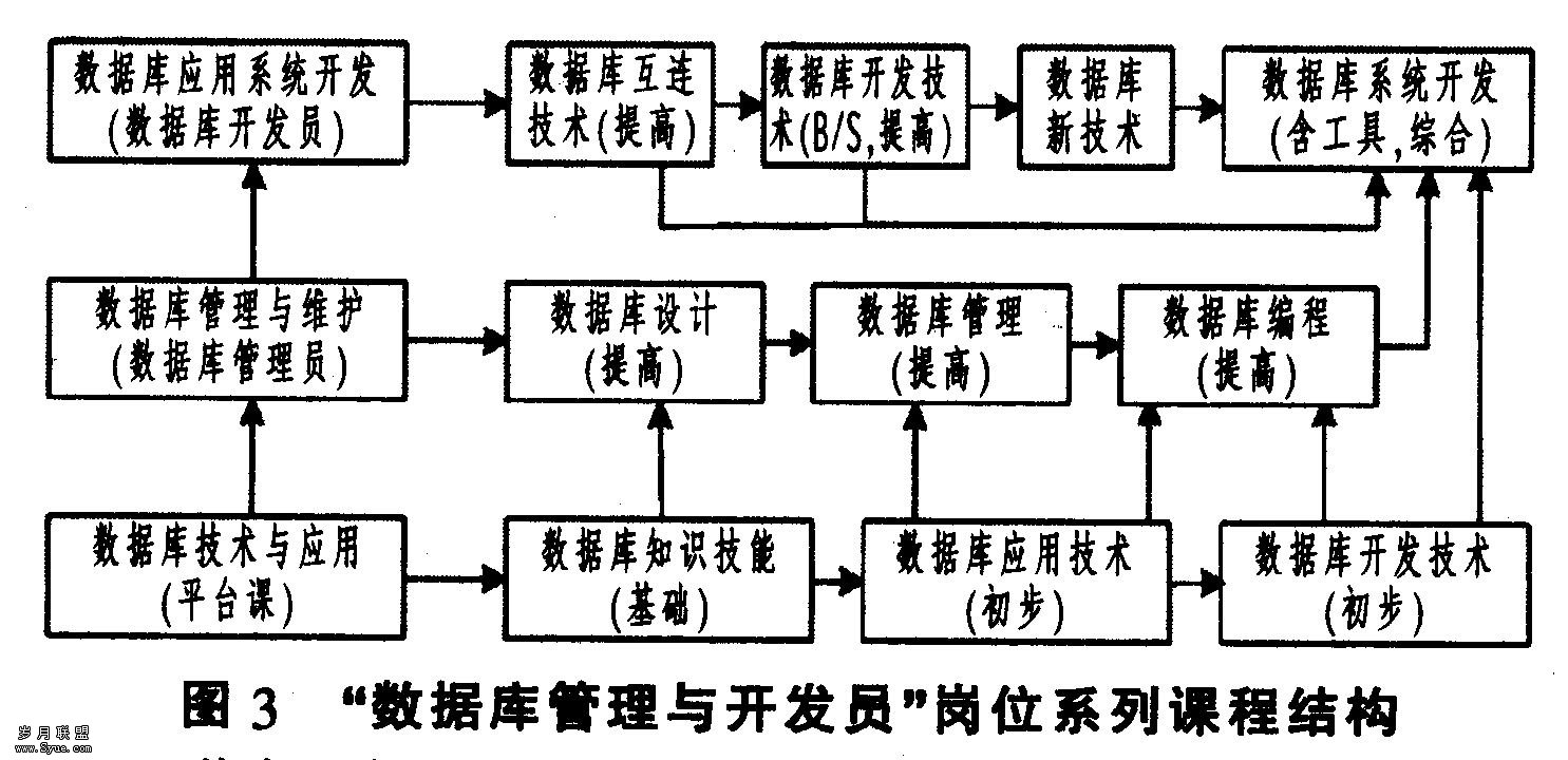 职业平台课(A):传授必需的岗位(群)知识和基本技能,是大类专业平台课。 岗位技术技能课(B):培养岗位(群)专门能力,是岗位能力课。 岗位综合实训课(C):培养学生实际动手操作及综合应用能力,是岗位实践课。、 岗位系列课程教学内容体系必须强调整体性.形成岗位知识和技能体系,必须明确每门课的教学重点,特别是实验、实训及课程设计等项目内容.课间内容有联系但一般不重复。岗位系列课程中.课程教学次序为:职业平台课—岗位技术技能课—岗位综合实训课。 (1)职业平台课。职业平台课主要传授岗位(群)必需的基本知识和基本技能,是大类专业平台课之一,是一门整合课程。教学方法一般采用问题教学法,教学方式可采用边讲边练方式进行,强调职业基本知识讲授和基本技能训练结合过程乙课时一般为64-72课时,理论讲授课时一般为总课时的1/2。 (2)岗位技术技能课。岗位技术技能课主要进行岗位核心技术应用能力培养和岗位专门技能训练,是岗位系,列课程的核心课程,是一门或多门整合课程。教学方法一般采用项目教学法,教学方式可采用项目组及校企合作方式进行,强调岗位核心能力的培养。课时为64-128课时(1—2门课),理论讲授课时一般为总课时的1/3。 (3)岗位综合实训课。岗位综合实训课主要进行职业岗位技能、技术应用能力的综合训练.是岗位系列课程的岗位综合实践课程,是职业平台课与岗位技术技能课的综合和提升。教学方法一般采用项目教学法,教学方式可采用项目组及校企合作方式进行,强调岗位知识和技能的综合应用能力的培养和岗位预就业性,强调实训项目的综合性和实用性,对实训成果进行认真规范评定。课时一般为3周(72课时),理论讲授课时一般为总课时的1/6。 (4)职业资格证书。每一岗位系列课程的教学内容体系必须符合相应职业资格证书要求.可以含多个职业资格证书的内容,但必须明确一个主要职业资格证书(或技能证书),主要职业资格证书(或技能证书)的应知和应会内容必须落实到各课程教学肉容和考核方案中。岗位系列课程中的每门课程必须明确技能项目的教学要求。 2.岗位系列课程特点 根据高职教育的特色和要求,依据岗位系列课程构建原则和基本思路,开展市场需求调研.确立职业岗位,进行岗位能力分析,确定岗位所需的知识能力体系,形成岗位系列课程结构。分析图1、图 2所示的岗位系列课程结构,有如下特点: (1)一个职业岗位人员的培养由“职业平台课”、“岗位技术技能课”及“岗位综合实训课”等三个层次(基础层、技能层、综合层)课程完成。 (2)每个层次的课程是由若干能力模块组成,各模块相对独立,但又有一定的联系。一个层次的课程一般是一门课程,但也可以由多门课程构成。 (3)三个层次的课程是递进式的,每层课程相对独立,但又不断提升。第一层次是知识技能型.第二层次是技术技能型,第三层次是岗位综合实践型。 (4)不同的层次课程可采用不同的课程教学模式,如:岗位综合实践型课程可采用工学结合的方式进行教学。 (5)易适应大类专业中的不同专业选用,符合专业群建设和资源共享要求。 (6)岗位系列课程能较好地解决传统课程模式的课程目标分散、结构层次不清、内容体系不合理、课间衔接不好等问题,从而提高课程教学效果.提高岗位应用型人才培养质量。 3.岗位系列课程例举 根据高职的特色和要求,依据岗位系列课程构建原则和基本思路,开展市场需求调研.确立“数据库管理与开发员”职业岗位,进行岗位能力分析,确定岗位所需的知识能力体系,形成“数据库管理与开发员”岗位系列课程结构,如图3所示。