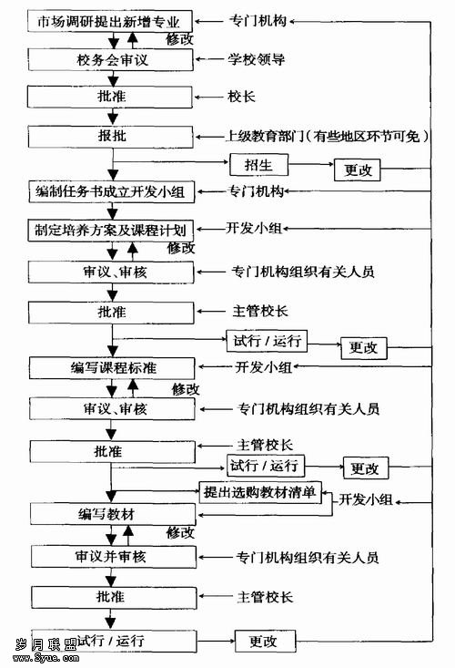1.成立专门机构。专门机构的主要职责包括进行市场调研,提出新增专业或老专业改造方案,并提请校务会审议后向上级部门申报;负责编制课程开发任务书并根据需要组成课程开发小组;负责组织各开发阶段的审议、审核及实施过程中的更改。配备的专职人员要具有较强的理论功底,熟悉高职课程开发特点,有较强的组织协调能力,并为某个专业的教育专家。专门机构是独立设置的学术型组织,从组织上保证了最大限度地减少行政命令干预和部门间利益纷争的影响。设置专业时是以市场需求和专业建设的为导向,而不是以保护部门利益及利用学校现有资源为前提。另外,专门机构配备的专职人员经过一段时间的锻炼能很快成为经验丰富的职业院校课程开发方面的专家,能比较准确地把握市场信息。同时,由于专门机构的成立,使工作流程缩短,工作效率提高,对信息的收集和反馈及时,形成对市场变化的快速反应机制。 2.组成课程开发小组,实行项目管理。开发新专业时,根据需要组成课程开发小组,实行项目管理。要建立一支相对稳定的课程开发队伍,课程开发小组人员的组成对保证课程开发质量尤为重要,要选拔本校专业理论水平高、教学经验丰富并有实践经验的与所开发课程有关的双师型专职教师,还要从社会上聘请各行业有经验的现场专家,有特殊需要时,也可以从外校聘请符合要求的教师。并且,所有参加课程开发的人员在工作前要进行与课程开发有关知识和能力方面的培训。 由于课程开发小组的成员是根据所开发的专业岗位需要来选配的,可能由两个或两个以上学科组成,不受教研室专业局限性和部门利益限制,这样才能真正做到根据岗位所需的知识、能力、素质结构要求来设计课程,才能真正实现学科交叉和课程融合,有利于培养复合型的人才。有条件的学校,课程开发人员在课程开发期间最好不承担其他任务,以保证课程开发的质量和效率。 3.加强过程管理,保证课程开发质量。加强对课程开发全过程的管理,规定工作流程及工作职责,同时规定在课程开发的各个阶段(如人才培养方案及课程计划、课程标准、教材的三个开发阶段)对阶段性成果进行审议、审核,并在实施前经过领导批准,以保证开发结果的充分性,适宜性、有效性。在开发或试行(运行)过程中,如发现问题,由发现部门或人员向专门机构提出更改要求,开发小组负责更改,由专门机构负责组织审议、审核,实施前,需经学校领导再次批准。新专业试运行一轮后,专门机构要组织人员对开设的新专业进行评价,以确认课程开发质量。评价内容一般包括招收学生人数,课程计划、课程标准及教材是否充分与适宜,是否需要更改,培养的学生能否达到人才培养方案所规定的要求,能否满足社会需要及岗位要求等等。 三、课程开发过程中需要注意的问题 第一,本方案是为发展到一定规模、一定层次的高职院校提高管理水平和人才培养质量而提出的,也适合规模较小,发展初期的职业学校,但对于规模较大,师资相对不足的学校不适用。第二,本方案比较适合扁平式的管理模式,对学校现行的管理模式有可能造成冲击。第三,对专门机构和关键人员依赖性增强。第四,课程开发人员的培养是一个渐进的过程,不可能一蹴而就。此方案由于工作流程短,涉及部门少、人员少,过程接口少,可大大提高工作效率,也提高了对市场的快速反应能力。并且,把课程开发的整个过程作为一个大过程进行系统管理,目标明确,责任清晰,从管理上保证了课程开发质量。同时,最大限度地减少了“因人设课”的现象,也有利于复合型人才培养方案的制定,从源头上保障了人才培养的质量。 [] [1]赵金玉.学校实战2000版IS09001标准[M].北京:计量出版社,2005. [2]芮明杰.管:的观点[M]上海:上海人民出版社,2002.