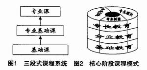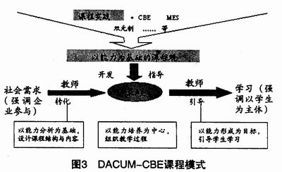 学科体系的课程编排是平行结构,它考虑了学习过程中学习者认知的心理顺序,即由浅人深、由易到难、由表及里的“时序”串行。但对于具有职业岗位针对性的高等职业教育而言,它缺乏对实际的多个职业活动过程经过归纳、抽象、整合后的职业活动顺序组合,使得学生心理顺序与行动顺序不完全一致,导致学与用之间的脱节、知识与能力之间的背反。因此,随着高等职业教育改革的不断深化,课程模式的改革也在不断地探索之中。如前所述,大规模的学习、借鉴各国高职课程模式成为探索高职课程特色的重要基础。 (一)基于德国“双元制”的核心阶梯课程模式 这种课程模式,更多地用于中等职业教育。它以专业实践活动为核心,将课程整体结构分为职业基础教育、职业分业教育和职业专长教育3个阶梯 (阶段)。如图2所示,以制造业的专业理论、专业、专业制图3个专业实践活动为划分,分阶段进行职业基础教育、职业分业教育和职业专长教育。“双元制”模式在我国产生了很大影响,其特点是紧紧依靠行业办学,突出了课堂与工厂、书本与实践、老师与师傅的双元培养特征,充分提高了学生的实践能力。但要实施这样的模式,需要在法制完备的运行机制下校企双方紧密结合,需要大量的设备、资金投入。 (二)加拿大CBE模式 它是以加拿大社区学院职业教育类课程开发采用的DACUM-CBE为基础,引进、消化和吸收的 (见图3)。它对纠正以学科体系为中心构建职业教育课程体系的传统做法有积极的意义。这里的能力 (Competency)具有职业资格的含义,包含3个方面的内容:知识、技能和态度(Knowledge,Skill,Attitude),它更适应于职业能力养成中的业务能力开发。因为完全采取能力分析的定量方法(Duty-Task表),对非技能型能力难以准确分析,忽视个人与内在精神的培养,将任务叠加作为能力综合,忽视整体大于部分之和,是还原主义能力观,所以知识的系统性差。