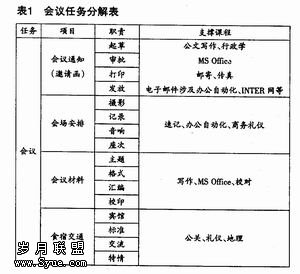 (一)任务选择 文秘专业涉及的工作任务很多,我们选取一个比较常见且重要的任务——“办会”来加以说明。 (二)项目分析 针对组织会议的需要,组织教师和一些政府机关秘书处、会议公司、学校办公室负责同志等就会议组织过程中的工作项目进行认真的归纳、研究,在剔除了一些枝节性工作后,确定了4个主要项目,即会议通知(邀请函)、会场安排、会议材料、食宿。完成这4个项目,学生就可以全面、真实地掌握会议组织的基本环节要求。 (三)职责划分 结合会议工作项目的要求,组织上述同志对每个项目所承担的职业岗位职责进行开发。经过分析,得出在会议通知(邀请函)项目中,应涉及起草、审批、打印、发放4项职责;在会场安排项目中,应涉及摄影、记录、音响、座次4项职责;在会议材料项目中,应涉及主题、格式、汇编、校印4项职责;在食宿交通项目中,应涉及宾馆、标准、交通、特情4项职责。职责是完成项目必需的工作环节,也是课程教学内容选择与重组的重要依据,因此必须认真、审慎地把握其科学性和合理性。 (四)课程选择 在分析出工作项目和相关岗位职责的基础上,教师将依据知识传授的科学规律,组合支撑课程的内容。对应会议通知(邀请函)项目,其支撑课程为公文写作、行政学、MS Office、邮寄、传真、邮件及办公自动化、因特网等;对应会场安排项目,其支撑课程为速记、办公自动化、商务礼仪等;对应会议材料项目,其支撑课程为写作、MS Office、校对等;对应食宿交通项目,其支撑课程为公关、礼仪、地理等。对应相关课程还要依照职责要求改革课程体系和教学内容,使其贴近职业岗位要求。 (五)安排文秘实训室 要完成上述实训,还必须创设一个模拟真实工作环境,适合项目运作和学生练习的场所。文秘实训室布局可以采取“回”字型,将有关项目分列在不同区域,配备相应的设备和项目操作指南、记录本等,便于安排学生实际训练。这样的实训室既可以 完成整个实训环节的循环演练,也可以结合课堂教学涉及的内容及时进行专项训练。 (六)实践学生在系统学习了支撑课程的必要知识后,将以会议任务为综合实训内容进入为期 1—2周的实践活动 每个班分成四组,每组1—2天,轮流完成4个项目。每组指定一个学生作为协调员,负责协调大家的思路并使之统一到一个共同的决策中来,这样就锻炼了学生的团结协作精神。同时,每组在每个项目中均轮流由不同学生充当协调员,使所有学生均得到锻炼。 (七)集中考核 因为学生分组轮换每一个项目,所以成绩的考核也就有了特定的评判方式。理论课考核以对知识的理解为主,采取开放式考题,占总成绩的20%。完成项目的成绩由学生之间评价和教师评价结合进行,其中学生之间的互评占40%,教师的评价占 40%。完成项目的情况通过每组的项目报告书和一系列成型的成果(如邀请函、会议记录)决定,学生之间可以质询,然后每个学生都给其他人打分,经过平均即得出学生的打分情况。教师则从更高的角度审视学生的基本能力情况,给出分数。对于达不到合格要求的,安排下一次在别的班重做。至此,学生在学习了具有明显任务导向的相关知识后,又系统地接受了完成任务的综合训练,既锻炼了学生的实际工作能力,又增强了学生之间合作、共事的能力,对学生考核也进行了质的改革。 [] [1]顾明远.教育大辞典[Z]上海:上海教育出版杜,1999. [2]翟轰.高等职业技术教育概论[M].西安:西安电子科技大学出版社,2002. [3]冯晋祥.中外高等职业技术教育比较[M].北京:高等教育出版社,2002. [4]黄春麟.高等职业教育专业设置的理论与实践[M].西安:西安电子科技大学出版社,2004. [5]雷正光.高职课程及其体系和目标研究[J].职教,2005,(6). [6]姜大源.关于职业教育课程体系的思考[J].职业技术教育,2003,(5). [7]蒋乃平.“宽基础、活模块”的理论与实践[M].宁波:宁波出版社,1999. [8]UNESCO.国际教育标准分类法[S].ISCED.1997. [9]蒋庆斌,徐国庆.基于工作任务的职业教育项目课程研究[J].职业技术教育,2005,(22).