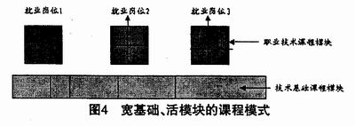 (三)模块式技能组合课程模式(MES) 这是国际劳工组织为在职职工培训设计的课程模式,其主要特点是:干什么,学什么。首先制定岗位工作描述表,然后建立学习单元、顺序组合、课程大纲,这种模式不适合正规学校教育。 (四)职业群集课程模式 它的特点是将整个职业教育过程划分为职业试探和职业定向两个阶段,学校教育带有准备教育的性质,上岗前还要接受短期训练。学校对学生只进行入口技能的教学,即核心技能。例如,美国教育总署(美国教育部的前身)把所有职业分为15个职业群:农业和自然资源;商业与公共事业类;通讯和媒体类;建筑类;消费者和家政类;环境类;和人文类;卫生保健类;餐饮和娱乐类;制造业类;航海类;市场和销售类;私人服务类;公共服务类;运输类。 (五)“宽基础、活模块”课程模式 蒋乃平先生提出的“宽基础、活模块”的课程模式,把课程的开发分割为3个过程:课程目标分析(包括教育政策分析);编制计划、大纲、教材;课程评价。所谓宽基础,即通用技能训练和关键能力培养,一般包括文化类板块、工具类板块、公共类板块、职业群专业板块。所谓活模块,即各类课程多设计成可以独立和衔接的模块,可以任意组合(见图4)。