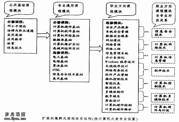 摘 要:提出了一种扩展的集群式课程体系——就业导向的模块化动态课程体系。即:按大类专业 (以机大类专业为实例)设置专业通用课程模块和职业方向课程模块,并根据技术变化和市场对各职业方向人才的需求情况,动态修改、增加或减少部分职业方向课程模块,调整选修相应模块的学生人数。通过新生进校后不分专业,按大类专业组织教学,第一学年学习公共基础模块和专业通用模块.第二、三学年选修职业方向模块的方式来实施该课程体系。 关键词:就业导向;模块化;动态性;课程体系 当前,我国正逐步向信息业大国迈进,对IT应用型技术人才的需求增加,要求也越来越高。这给高等职业技术特别是IT教育事业的创造了良好的外部环境,使计算机类专业得到了迅速发展,几乎所有的工科高职院校都开办有计算机专业。随着职业教育改革的不断深入和计算机类专业大量学生毕业进入社会,当前高职计算机类专业存在的许多问题逐渐显现了出来。其中最主要的问题是课程设置不适合社会需要,因此,我院(重庆科技职业
