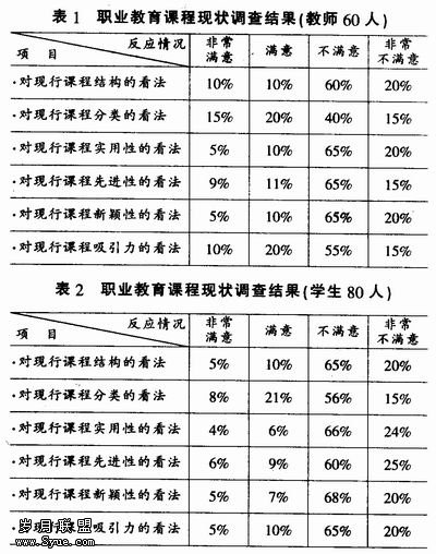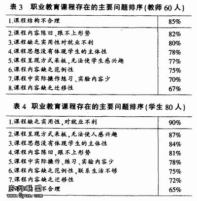 关于第二类调查的结果,分别列于表3、表4中。从表3中可以看出,由职业教育教师列出的问题,按照顺序依次是:课程结构不合理;课程内容陈旧、跟不上形势;课程缺乏实用性、对就业不利,课程思想没有体现学生的主体性;课程呈现方式呆板,无法使学生感兴趣;课程内容缺乏范例性,联系生活不够;课程中实际操作练习和实验内容少;课程内容缺乏迁移性。从表4中可以看出,由职业学校学生列出的问题,按照顺序依次是:课程缺乏实用性,对就业不利;课程呈现方式呆板,无法使人感兴趣;课程思想没有体现学生的主体性;课程内容陈旧,跟不上形势;课程中实际操作、练习、实验内容少;课程内容缺乏范例性,联系生活不够;课程内容缺乏迁移性;课程结构不合理。从内容上看,学生与教师相比较,前者更关注与自己未来工作和现实学习相关联的问题,而后者则更关注课程自身结构性的问题。但是,无论如何,对于这八大问题,教师与学生都给予了重视和强调,总体认识上具有一致性。