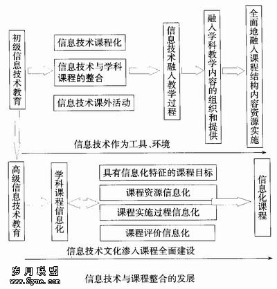 信息技术文化视野下课程改革的过程 信息技术文化视野下课程改革的过程是课程信息化,它是构建信息化课程的基本过程。课程信息化是课程理论和课程实践的发展,是一种课程变革的方式。它是教育信息化的微观和核心层次,是教育信息化的人才培养目标实现的载体,也是教育信息化的技 术和教育特征体现的基本途径。 课程信息化这一过程,本身也是更高层次的信息技术教育形式(如图),它是信息技术与课程整合的发展,它与整合存在着工具到文化、操作到决策、继承到发展、基础和目标的因果关联。存在着研究的范围、研究的目标、研究的途径、对信息技术的定位不同等本质区别。它是信息技术文化中课程全面革命的过程。课程信息化是在信息技术文化中课程发展或者革命的过程,是将信息技术、信息资源、信息方法渗入到课程设计和课程操作中。课程设计主要指课程的目标、内容和资料的变革,而课程操作是指教和学的手段、方法及课程评价等的变革。即它意味着把信息技术、信息资源、信息方法和课程标准、课程内容、课程实施、课程评价有机结合在一起,对课程的各个层面和维度都产生变革作用,进而促进课程整体的变革而产生信息化课程。它是一种基于信息技术文化的课程研制理论和实践。