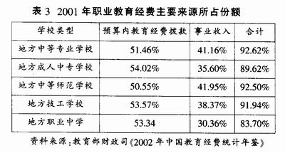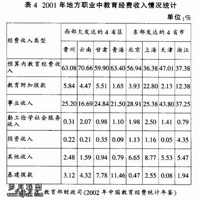 随着财政性教育经费支出的结构调整,其他的职业教育经费筹措渠道又没有跟进,这就使得职业教育经费来源真正是捉襟见肘。具体地说,全国多数省、市、区没有按照《中华人民共和国职业教育法》的要求,制定出职业学校生均经费标准,多渠道筹措职业教育经费缺乏应有的标准.因而在实际筹措中,宏观调控难以实行。这样一来,职业教育的经费主要是依靠预算内教育经费拨款和收取学生的学杂费,两项合计占到职业教育总经费的大约90%左右。而教育附加拨款、勤丁俭学和社会服务收入、捐款和集资收入、基建拨款所占比例则在10%左右。东西部职业教育经费来源还呈现出一种奇特结构:东部发达地区预算内教育经费拨款、基建拨款的比例降低,而学生学杂费比例上升.其他教育附加拨款、勤工俭学和社会服务收入、捐款和集资收入所占比例也呈现出上升的态势。而西部欠发达地区预算内教育经费拨款、基建拨款的比例较高,学生学杂费比例较低,其他职业教育经费来源的比例呈现出微乎其微的态势。我们以2001年地方职业中学教育经费收入情况为例,将西部欠发达的4省与东部发达的4省市进行比较,可以看到这种差距。这种情况表明,西部职业教育经费收入的来源主要依靠财政预算内拨款,而西部职业教育中收取学生的事业收入费用部分在逐步加大。