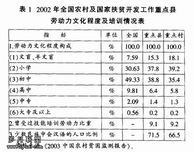 关键词:西部;农村;职教;问题;解决;途径 一、贫困地区农村接受职教的人数比例太低 自2002年全国职业教育工作会议以来.我国职业教育虽然取得了新的重大成就,但仍不能适应全面建设小康社会的需要。目前,我国有数,以亿计的农村富余劳动力急需进行技能培训;我国高级技工、技师占技术工人总量的比例只有 3.5%左右,远远低于发达国家20%至40%的水平。我国每年大约有2000万初中生毕业.其中 700多万人升入普通高中,500多万人进入职业学校,还有700多万人,主要是农村初中毕业生.没有机会接受职业教育和培训.直接进入劳动力市场。 国家统计局农村社会调查总队的贫困监测数据表明,贫困地区农村接受职业技术教育的人数比例太低,西部国家扶贫开发工作重点县的情况尤其令人担忧。 由上述数据我们可以看到,在国家扶贫工作重点村,接受过中专和大专职业技术教育的人数比例只有1.5%,曾接受过短期培训的劳动力也只有9.2%。而众所周知,西部国家扶贫工作重点县主要集中在西部地区。由于接受职业技术教育的人数比例太低,西部贫困地区的农产.只能凭借着世代相传的传统耕作技术,在贫瘠的土地上刨饭吃,打工无路.致富无门,脱贫无望。 二、接受职业技术教育的人数比例太低原因分析 造成西部贫困地区接受职业技术教育的人数比例太低的原因,既有客观方面的也有主观方面的,既有的也有现实的,既有职业学校方面的也有农户自身方面的。第一,经费投入严重不足和贫困农户子女交不起学费。农村职业学校除按普通中学的标准 (人头费)拨款外,很少有其他补贴。有些经济欠发达的地方,就连人头费也难以保证。经费的紧张使得一些必备的教学仪器和设施无力购买,基地无法开发,实验无法进行。同时经费的不足严重制约了农村职业学校适应市场、调整培养方向能力的发挥。有些学校即使通过借贷,超前,改善了办学条件,沉重的债务也影响了今后教学活动的开展。我国财政性教育经费支出从1996年开始,进行了结构调整。在教育经费总支出中,小学和初中教育约占54%,职业教育约占11%,普通高等教育约占19%,而且1997年也大致维持了这一比例。但是,到2001年此比例发生了较大的变化,职业技术教育所占的比重越来越小。