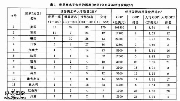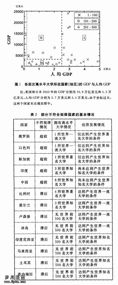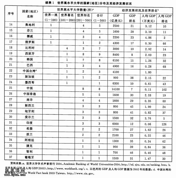表1给出了世界高水平大学的国家或地区分布、这些国家或地区2003年GDP总量和人均 GDP,以及它们在世界上的相对位置。从表1可以看出,目前世界前500名的大学分布在37个国家或地区,这些国家或地区的GDP排名都在世界前50名。有17个国家有世界一流大学,它们全部是发达国家,其GDP都处于世界前40名,人均GDP处于世界前30名(俄罗斯除外),其中美、英、日、德四国集中了近3/4的世界一流大学,而美国更是聚集了一半的世界一流大学。特别是排名前20位的世界顶尖大学(World Top University)中,美国有17所,英国2所,日本1所。