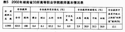 表5是湖南省33所独立设置的职业技术学院 2002年教师基本情况调查表,此表显示,专任教师的学历、职称明显偏低,特别是“双师型”教师的比例只有13%,与教育部提出的30%的基本要求相差甚远。受教学条件的限制,加之高等职业教育办学模式的探索还需有一个过程,行业、企业参与人才培养的程度不够,使目前高等职业教育的特色不够鲜明。