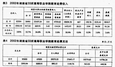 一是财政拨款的基数过低。凡普通中专升格和合并的高职学院,财政拨款基数还是20世纪90年代中期的标准。如湖南工业职业技术学院、岳阳职业技术学院的财政拨款基数是1993年办中专时的标准和额度。二是部门、行业的支持力度不够。办职业技术学院的部门、行业,很难按法规的要求,给学校拨付办学经费,连申办职业技术学院时承诺的经费也很难兑现。三是融资难度大。银行向职业技术学院贷款的积极性不高,从其他渠道融资也困难重重。四是在高等教育经费安排上,国家和省基本上把职业技术学院排除在外。从我们对33所职业学院2002年度经费收支情况进行的调查看(见表3、表 4),这些学校主要是依靠收取学杂费来维持运转,学杂费收入占到总收入的58.9%,预算内教育经费收入只占总支出的40%,基建拨款只占基建支出的 20%。