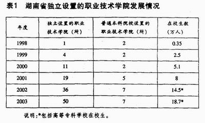 湖南高等职业教育主要是通过普通中专学校和成人高校合并,或几所普通中专学校合并,或由成人高校和普通专科学校单独改制发展起来的,其中80%以上是以普通中专学校为主组建的,充分发挥了普通中专教育已有的经验和优势,实现了低成本扩张,在国家投资有限的情况下,使高等职业教育在短期内得到了快速发展。