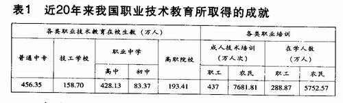 1985年5月27日发布的《中共中央关于教育体制改革的决定》(以下称《决定》)提出:“逐步建立起一个从初级到高级,行业配套,结构合理又能与普通教育相互沟通的职业技术教育体系。”据教育部统计,截至到2002年,全国已有普通中等专业学校在校生456.35万人;技工学校在校生158.70万人;职业中学在校生511.50万人,其中高中生428.13万人,初中生83.37万人;高职(专科)院校在校生193.41万人。成人技术培训结业8118.81万人次,其中培训结业职工437万人次,培训结业农民7681.81万人次;在校学习6041.44万人,其中职工288.87万人,农民 5752.57万人。至此,1985年《决定》所提出建立我国职业技术教育体系的要求已初步实现。