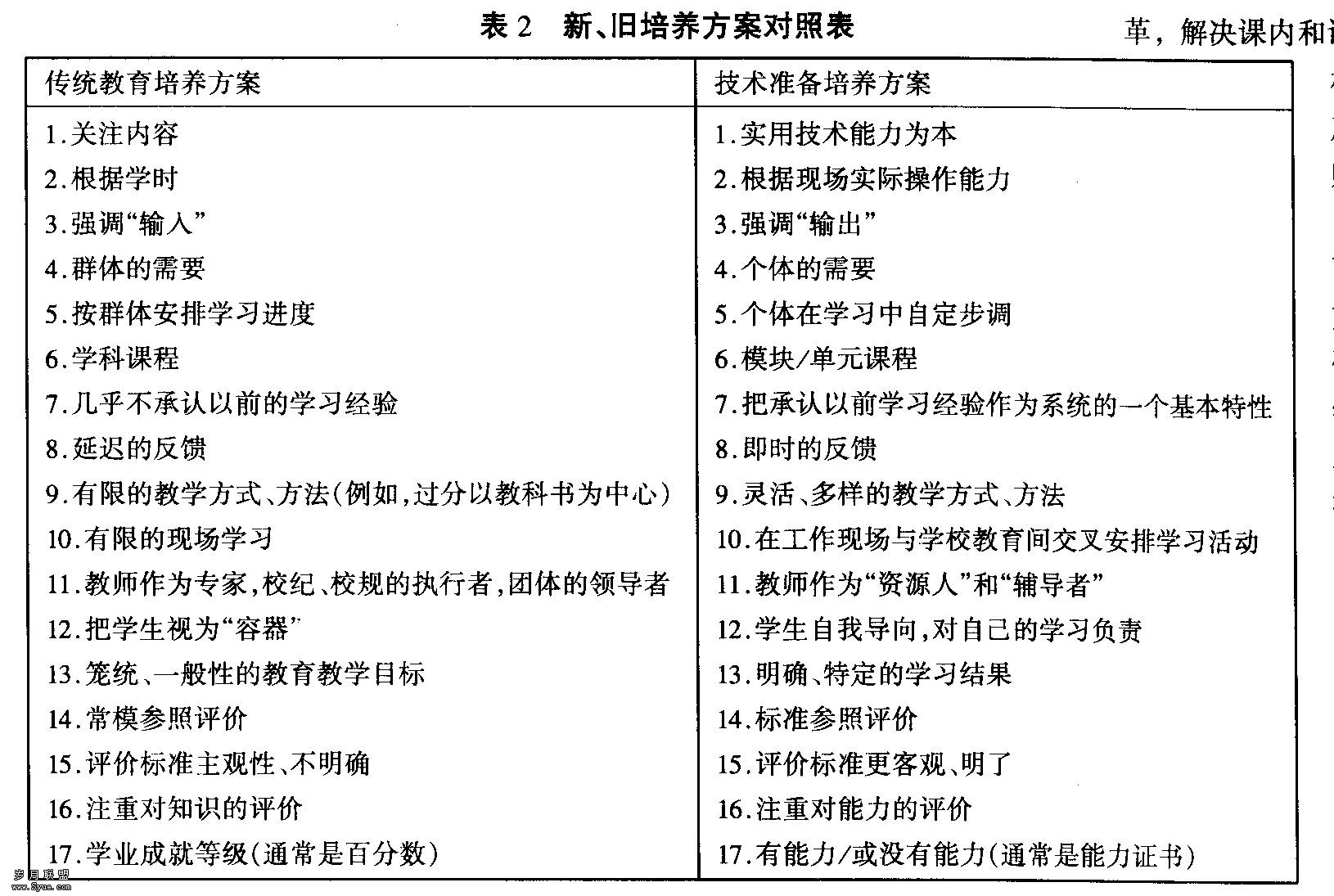 三、高职教育改革的关键 由于教学改革的过程是一个研究与实践的过程,因此教师、资源、管理、条件都是核心的、关键的问题。 1.教师角色职能的转变。在教改中教师承担着如下的角色职能:①提供学习信息;②激发学习动机;③帮助学生制订学习计划(技术准备计划);④开发学习资源和安排学习活动;⑤记录管生学习进度情况;⑥对学生能力进行评定。这种角色职能将使知识的传授者,校纪、校规的执行者,团体的领导者的传统教师角色定位转变为“资源人”或“辅导员”,这样的转变将对教学改革的成效起决定作用。 2.学习资源的开发。这些学习资源通常包括:教材、书、辅导性的印刷材料、各种视听材料(如教学电影、录相带、磁盘、光盘)、机软件等。另外,学习资源也指可以提供给学生进行实做练习的各种设备、模拟工场、实训基地等。 3.教学管理方面的革新。在学籍管理上,要突破传统的时间本位的学年制,实行开放的学分制;在教学安排上,要根据学生的学习进程、专业要求安排各不相同的技能学习与实习等,这种弹性、开放的教学管理,须充分适应学生学习的要求。要实现这些教学管理上的革新,一方面是教学管理人员观念上的转变;另一方面要借助信息技术使教学管理手段现代化、标准化、科学化。 4.创造和完善内外部的各方面保障条件。加强校园文化建设,营造实用技术人才培养教育的环境;要有相应的人力、财力、物力作保障;积极取得产业界的参与与支持,开展行动体系的实践课程改革,解决课内和课外相脱节、校内和校外相隔阂的状况,并解决生产实习场所、专业指导教师等实际问题。 对高等职业技术教育的实用技术人才培养方案进行改革的实践与研究,是培养和帮助高职学生顺利完成“从学校到工作的过渡”,是对现代社会生活要求提高劳动者职业能力的一种反应,顺应了现代社会能力本位的文化理念,相信这样的实践与研究将是非常有意义的。 参考 [1]教育与人力资源问题报告课题组.从人口大国迈向人力资源强国[M].北京:高等教育出版社,2003. [2]石伟平.比较职业技术教育[M].上海:华东师范大学出版社,2001. [3]钱方平.中国教育问题报告[M].北京:中国社会科学出版社,2002.