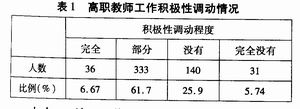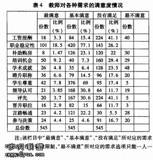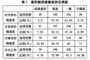 由表5可知,不同需求对教师的重要度依次为:学术成就、补助购房、职业稳定性、工资报酬、培训机会、聘升职称、言路畅通、晋升职位、参与决策、评先进、领导认可。 高职教师内心最重要需求的重要度依次为:学术成就、学生尊重、工资报酬、职业稳定性、聘升职称、培训机会、补助购房、言路畅通、领导认可、晋升职位、评先进、参与决策。 可见,高职教师内心重要需求和最重要需求在学术成就、工资报酬、职业稳定性、聘升职称等方面两者是相同的;购房、培训等则有不同评价,它们是大家都认为的重要需求,但不是大家都认为的最重要的第一需求因素。另外,晋升职位、评为先进、参与决策是排名前列的几项需求,但却是大家很少选择的最重要需求。 三、成因分析 从上述调查中可以发现:高职教师有积极性于教学与科研的本职工作,对此有很强的行为动机;积极性完全调动的只占到6.67%,感到满意的需求因素很少,仅寥寥几项,感到不满意的需求因素反而很多;有较强烈、有独特的个性需求偏好。所以,动力激发与需求满意度之间、激励措施之间是有直接关系的,试作以下分析。 (一)低满意度导致了低工作积极性激发 对院、系、领导、自己的满意度以“一般”为主,其中“不满意”与“一般”之和占到约70%;对“职业稳定性”、“学生尊重”满意,对“聘升职称”勉强满意,其余则不满意,在所有项目中不满意的占到了约 80%。因此我们可以发现,这种低满意度直接决定厂高职教师较低的工作积极性的动力激发,决定了高职教师工作积极性调动以部分调动与不调动为主。 (二)有工作积极性激发是因为有部分需求被较好满足,其需求偏好与激励措施较好隅合,此时的激励效用高 工作积极性完全调动的只占到6.67%,这取决于高职教师的需求因素中有部分得以很好地满足,实践中表现为对“职业稳定性”、“学生尊重”满意,对“聘升职称”勉强满意,另外还有高职教师的精神责任因素。而这种需求的很好满足,又源于高职教师的需求偏好与高职院校的激励措施、环境较好地隅合。 根据调查资料,高职教师的需求偏好按比例大小排列是:学术成就、工资报酬、职业稳定性、聘升职称,购房、培训,以及评为先进、参与决策等。在高职院校管理与激励制度中,比较有优势的是:国家事业单位的安全性、持久性、可靠性,所以正好隅合满足比较重要的需求偏好“职业稳定性”;较高的社会地位、尊师重教的氛围,充分享受“尊重”的需求满足;因为科研成果相对落后,高职院校中的职称聘升比之普通高校会有所不利,但相比社会其他单位仍是正常和及时的,于是在“聘升职称”方面是“勉强满意”。另外,高职教师对专业的兴趣、对学生的责任心、成就与创新的需要,尤其是高职院校对日常教学管理的认真严格、对科研的日趋重视而激励力度的加大,推动高职教师越来越重视教学与科研,使得保持较强的积极性于教学、科研活动中。总之,由调研可知:高职教师的满意度不高、动力激发值也不高,虽然有一定满意度与动力激发,但这种满意度与动机激发力仍是属于原始本能的层次,还非常缺乏有效激励体系的激发,需要与动力激发机制相隅合的激励体系。 (三)动力不激发是因为相关激励措施未能满足需求,实质是教师需求偏好与学院激励措施未隅合 调查发现,满意度不高,对学校、系部、领导以及自己的满意度以“一般”的比重最高,“基本满意”次之,“不满意”的比例不低(16.58%)、“高满意”很少 (4.16%)。表现为:高职教师不满意的需求有学术科研、工资报酬以及领导的态度(沟通与认可)、培训成长的机会、补助购房等。其中年轻教师没有满足的需求与最不满意的需求有购房、参与决策、培训机会,说明这三者是最为突出的;有一定资历教师需求要素的不满足度排列为:学术成就、领导认可、工资报酬、参与决策、言路畅通、培训机会……所以,就有动力激发的调查结果:高职教师的工作积极性以部分调动为主(60%强的教师认为自己的积极性只有部分调动),完全调动的仅占极少数(6.67%),未调动的比例很高(30%强)。 这种情况可以用高职教师动力激发机制加以解释,其中根本原因是没有隅合动力激发机制,在需求偏好、激励效用偏好满足,边际效用递减遵从,效用最大化与最佳动力激发的必须条件满足等方面存在严重问题。下面就比较典型的问题要素进行分析探讨。 1.高职教师动力激发机制要求根据需求偏好进行个性化奖惩,而实践中一般难以照顾激励对象的个性化要求,一般都是群体一律,因而使得效用值打折,动力值打折。 2.奖惩要言而有信,尽速兑现不拖延,如此才能保证激励效用值。而实际中往往许诺夸口在先、事后不知所终再也不提当初承诺,或者拖拖延延等人兴致全无后再兑现激励,如此都使激励的效用值大大降低,动力值下降。 3.动力激发机制中边际效用递减规律,要求依效用指数大小决定激励措施的先后、数量权重,但实践中的奖惩措施难以如此、细致。 需求激励效用递减规律,要求同一激励措施不能多次奖惩同一人,要不同种类激励措施调换奖惩激励,要创新激励措施,但实践中大多激励措施缺乏创新,打折了激励的效用值;要求同一激励措施奖励不同人,即要照顾到“面”,这样能提高激励的效用值,但实践中获奖的多是原来的老面孔。 4.激励应以精神为主、物
