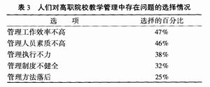 调查表明,高职院校的课程设置对实践教学环节的重视程度还不够,课程数量偏少,综合实训课程的开发远远不足,选修课程的数量少且面向窄,时有照搬本科课程的现象。 因此,开发综合性实践课程,配套实用的指导教材,加强实验实训实习以及毕业设计等环节的实践教学,是保证高职院校教学质量不可忽视的领域,同时在推广实行学分制的过程中整合各类课程,推陈出新,丰富课程数量也是课程改革的有效途径。 对教材的意见主要集中于内容不够精练实用,实践性不强,有照搬本科现象,没有体现高职教材特色等。因此,学校要大力加强教材开发,注重教材的性、实用性和实践性,尤其要注重实践教学环节的教材开发,培养学生在工作一线实际操作的动手能力。 第六,相当一部分的人反映高职院校的教学管理手段落后,效率低下,在采用化教学管理技术上缺乏主动、积极态度,管理人员素质不高(见表3)。在对“你认为你所在学校教学管理工作做得如何”的选择上,选择非常差的占12%,选择较差的占20%,选择一般的占43%。可见,相当一部分人对目前高职院校的教学管理是不甚满意的。 创建优质高职院校,离不开一流的教学管理。因此,重视教学管理人员的培养与培训,提高教学管理人员的专业化水平和综合管理素质,加快实施教学管理信息化工程,提高为教学一线师生服务的质量和水平,是教学管理改革的重要内容。