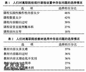 硬件(教室、语音室、实验室、实验设备等)”一题的选择中,25%的人认为差,32%的人认为较差,28%的人认为一般。而造成高职院校教学经费紧缺的原因,人们认为主要有三点:一是政府拨款太少,二是学校创收(含资助经费)有限,三是非教学性投入所占比例太大。 1993年,《中国教育改革与发展纲要》提出,到本世纪末我国的教育经费投入占GDP的比例将达到4%[1]。事实上,由于各种“压倒性”的投资需求,到目前为止还没有达到这一目标。所以我国的教育经费从总体上来说是短缺的,而且,高职院校大多是“属地化”管理,“输血”不足,加上自身“造血”功能的薄弱,经费使用的效率效益不高等因素,使高职院校的发展面临更多的经费困难。 因此,一方面国家和地方政府要加大对高职院校建设的经费投入和政策支持;另一方面,学校也要通过产学合作等途径,瞄准社会需求,瞄准行业标准,积极融人地方的发展,为社会发展提供智力支持,在“有为”的前提下,积极争取地方政府、行业企业更多的支持,实现校社、校企联动,做到互补双赢。 第三,师资队伍整体水平不高,课堂教学质量有待进一步提高。从我们的调查来看,被调查者中认为其所在学校师资的整体素质差的占6%,较差的占27%,一般的占43%,较好的占24%。在课堂教学方面,认为其所在学校任课教师的总体教学效果较差的占22%,一般的占56%,较好的仅占18%。同时,被调查者普遍反映教师在课堂教学中存在“以教师为中心”现象,缺乏因材施教,与学生课堂内外交流较少,存在“满堂灌”现象,36%的人认为其所在学校任课教师课堂内外与学生交流的时间非常少,47%的人认为较少,12%的人认为较多,仅有5%的人认为多。 分析师资队伍整体水平不高的原因,被调查者认为主要的原因是教师精力投入不够,校外兼课兼职过多。 造成高职院校师资队伍整体质量不高的原因是多方面的。许多通过“三改一补”等途径升格为高职的学校,原来是中专或成教的底子,举办高职的短,基础差;不少学校对教师的专业发展缺乏整体规划,在师资引进和内部培养上投入力度不够大;教师职业的收入偏低,远没有达到行业平均收入水平1.5—2倍的标准[2],教师的校外兼职现象一时难以杜绝,校内教学的时间精力投入有限;教师职业的心理压力较大,最近的一项调查表明,有64.4%的教师认为自己存在职业枯竭(job burnout)现象”[3]。 因此,教育主管部门应加强宏观管理,规范学校的办学行为,进一步提高教师的社会待遇和经济待遇。学校应关心教师的职业生涯发展,加快教师的培养与引进,关注教师的心理健康,激发教师的职业理想,提升教师以“师德,师魂,师能”为核心的综合竞争力,这是提高师资队伍质量和水平的当务之急。 第四,高职院校的专业设置不够科学、规范,现行专业中仍存在较多问题。调查中有47%的人认为高职教育资金投入不足,42%的人认为教师数量质量不够,33%的人认为专业设置脱离市场需要,18%的人认为学校因人设专业,从调查结果来看,超过一半的人对所在院校的专业设置不满意或不甚满意。 目前,高职院校专业设置方面的主要问题在于,不少专业没有紧贴社会经济发展的需要来培养人才,对人才需求的预期调查不够充分,因现有教师队伍实际而非社会市场需求设置专业,加上资金投入不足、师资力量欠缺等原因,导致各专业的建设参差不齐。 因此,学校应充分展开调研,了解人才需求动态,分析地缘优势,合理布局学科专业,开展错位经营,实施长短结合、热冷结合、缓急结合、轻重结合是比较现实与可行的选择。第五,高职院校现行课程设置与教材建设仍不尽如人意。调查显示,被调查者中对其所在学校开设的课程感到不满意或不甚满意的达61%,对其学校教学所使用教材感到不满意或不甚满意的达65%,而且还认为在其学校现行课程设置和使用教材上存在着相当多的问题(见表1、表2)。