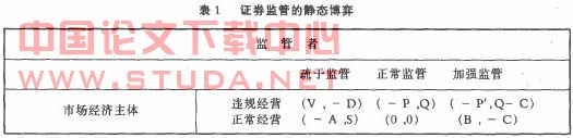 由前述条件,建立证券监管部门与市场经济主体经营选择的静态博弈模型如表1。