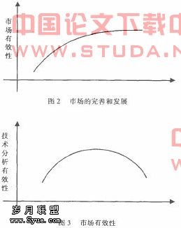 市场的完善和发展,包括规范性、监管、监督机制、信息披露机制的完善促进了市场有效性的提高,市场经历无效、弱有效、半强有效、强有效阶段。而技术分析有效性则成类似抛物线形发展。因为技术分析包涵对隐含信息的挖掘和分析,信息的不断公开和隐含信息的减少,使得价格的随机成分增加,技术分析的难度也会增大。