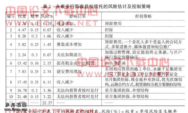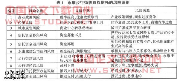 2.永康步行街收益权信托的风险分析。(1)风险识别。根据SWOT分析法和流程图法,得出永康步行街项目的风险主要有商业政策风险、经济风险、城市规划风险、信托资金募集风险、信托资金运用风险、永康城建公司违约风险、步行街建设风险、步行街招商风险和经营风险、信托投资收益支付和信托资金退出的违约风险(参见表1)。